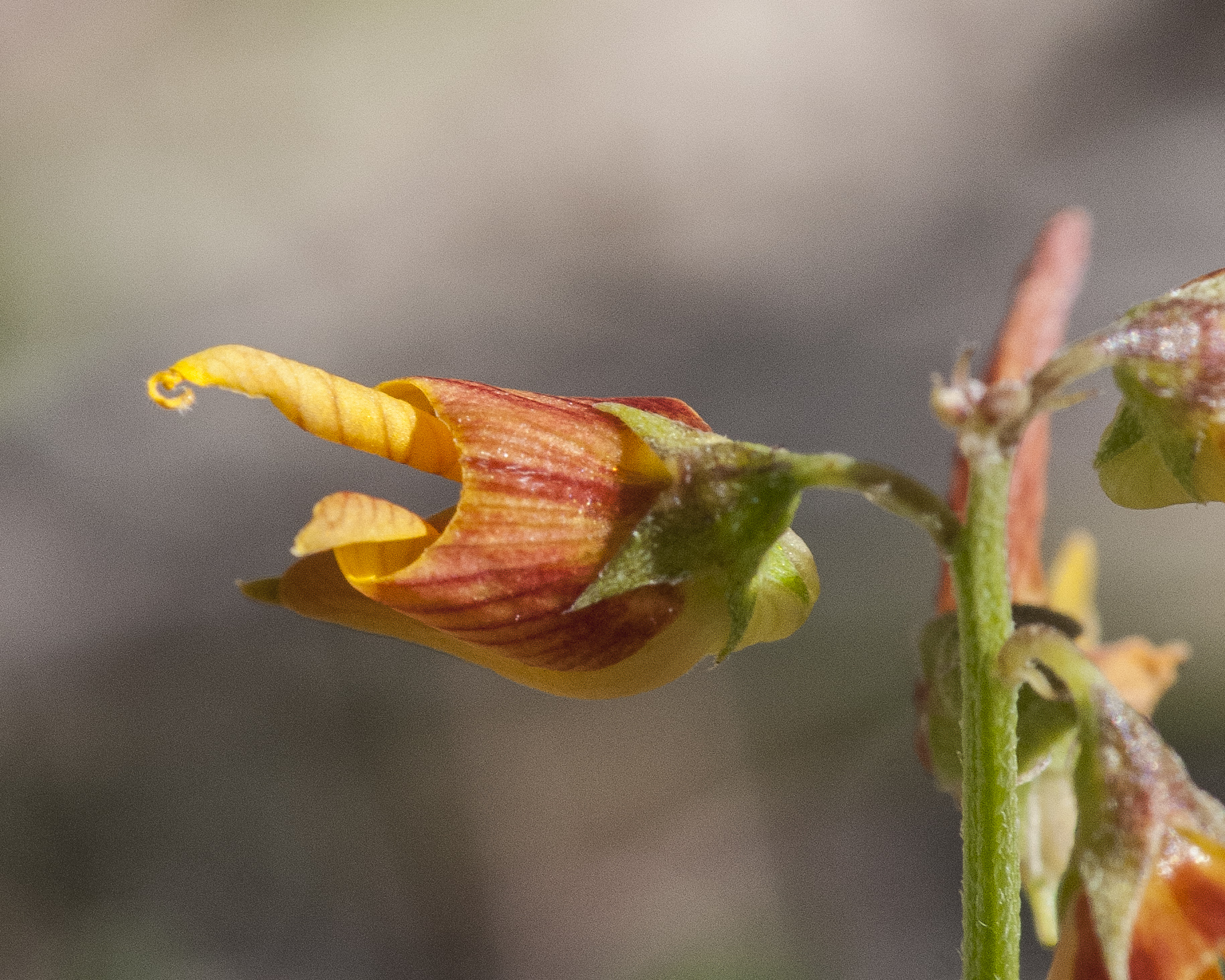 The flowers are in terminal and axillary racemes. The individual flowers are pea-like and have lightly to heavily red-streaked banner petals. The flowers are followed by large, plump, green seedpods with depressed seams. When shaken, the dry, brown seedpods make a rattling sound like that of a rattlesnake's tail. When fully dry, the seedpods explode open with an audible pop and eject the seeds a fair distance from the plant. The leaves are bright green, alternate, and trifolate with 3 oblanceolate leaflets. There is a stipule at the base of each petiole.