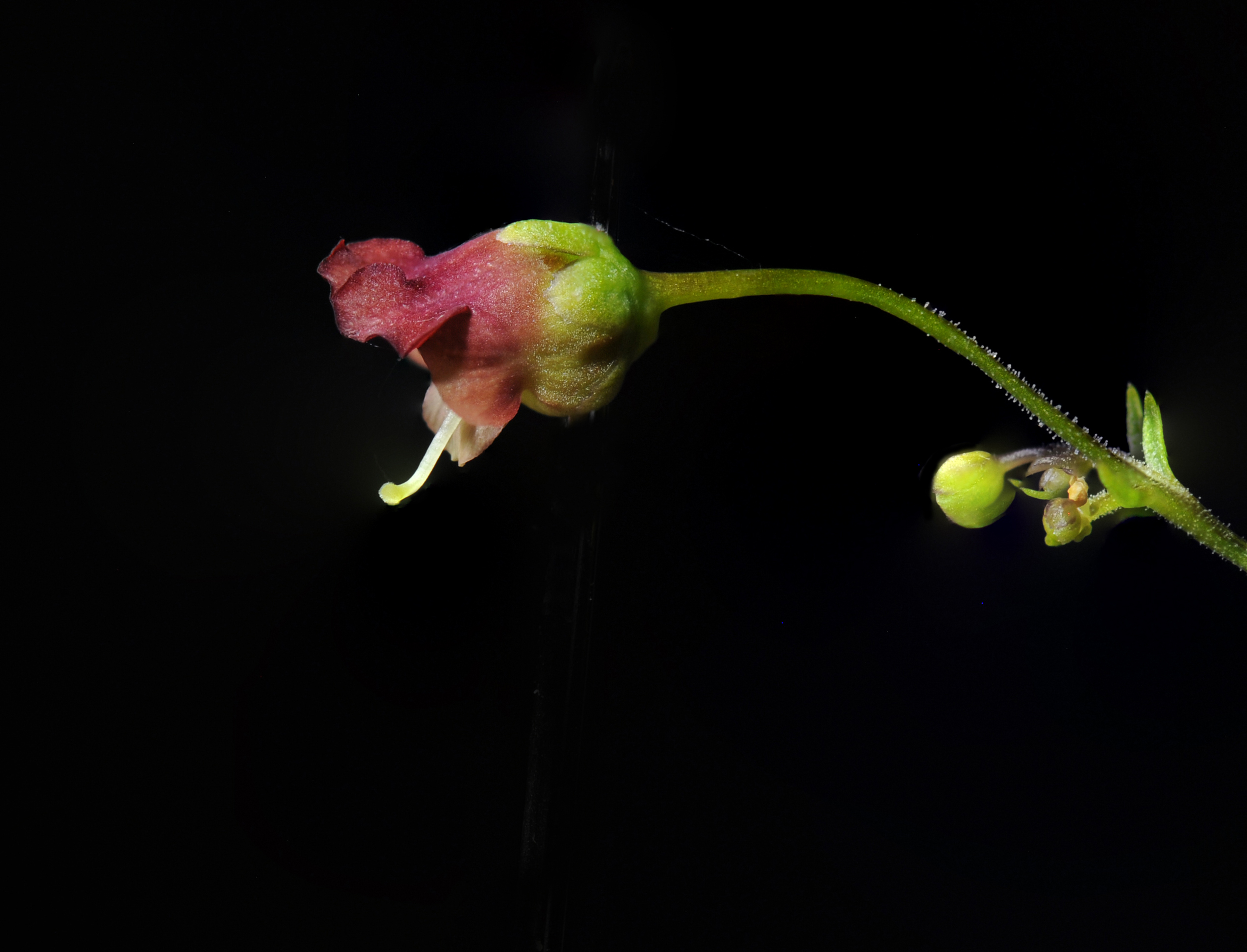 The small, rounded, broadly tubular flowers are borne in panicles and have 5 lobes with a recurved bottom lobe. The leaves are green, opposite, lanceolate, petioled, triangular in shape, and coarsely toothed. The stems are square in cross-section.